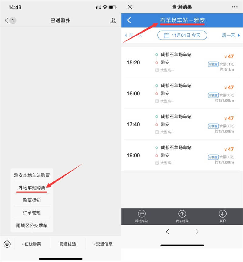 11月4日,蜀通公司線上購(gòu)票平臺(tái)“巴適雅州”微信公眾號(hào)開(kāi)通省內(nèi)外多地區(qū)汽車(chē)購(gòu)票業(yè)務(wù)。