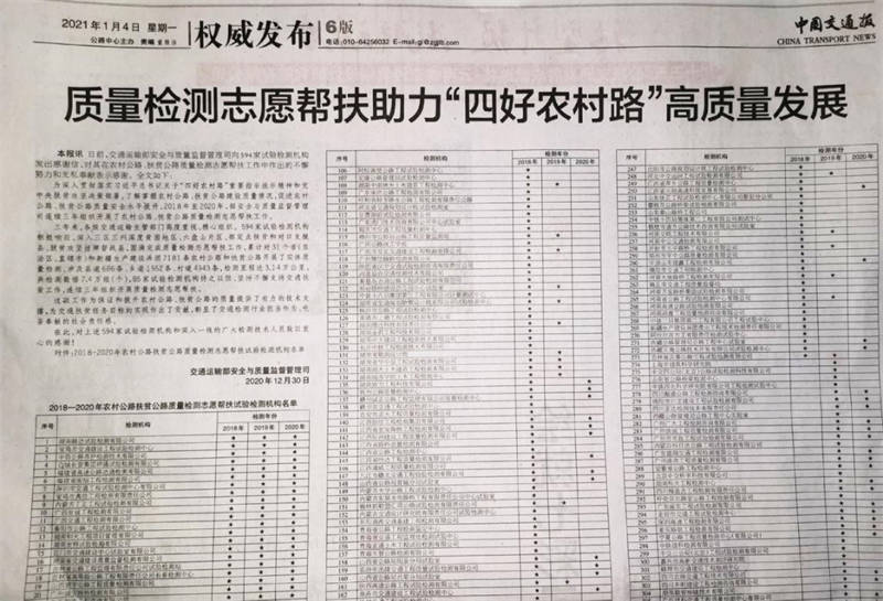 1月4日,中國(guó)交通報(bào)6版以《質(zhì)量檢測(cè)志愿幫扶助力“四好農(nóng)村路”高質(zhì)量發(fā)展》為題進(jìn)行報(bào)道。