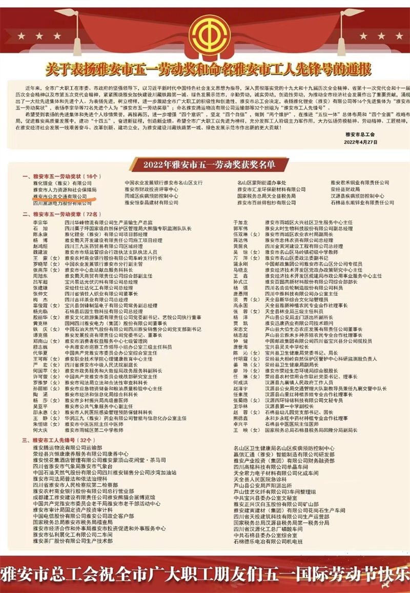 此次大會表彰雅安市五一勞動獎狀16個、雅安市五一勞動獎?wù)?2名、雅安市工人先鋒號32個,雅安市公共交通有限公司獲得“雅安市五一勞動獎狀”榮譽稱號。