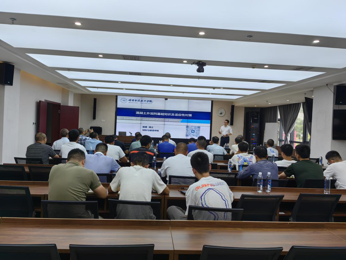 培訓(xùn)邀請綿陽職業(yè)技術(shù)學(xué)院材料與建造學(xué)院院長賈陸軍、蔣勇兩位博士授課,重點圍繞配合比設(shè)計中需注意的事項展開,詳細講解配合比設(shè)計要點,分析原材料選擇及礦粉、粉煤灰摻合料摻配比例的重要性,總結(jié)交流機制砂在混凝土中的應(yīng)用技術(shù),講解混凝土外加劑基礎(chǔ)知識、分析目前外加劑在使用過程中適應(yīng)性問題和原因,通過真實案例分析混凝土質(zhì)量問題的原因及管控要點等。