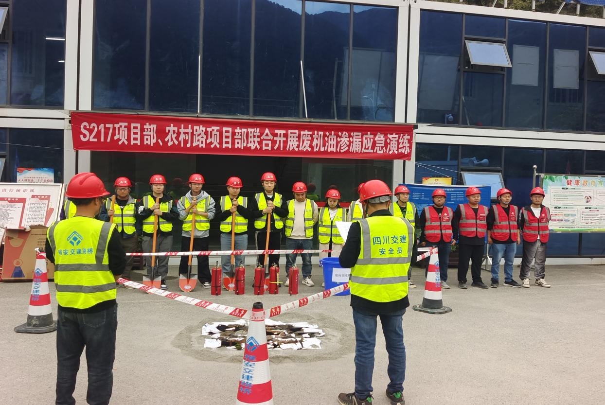 為提高項(xiàng)目管理人員與勞務(wù)人員應(yīng)對(duì)廢機(jī)油滲漏突發(fā)事件的能力,10月25日,雅安交建集團(tuán)路橋公司S217石棉縣王崗坪至石棉縣城段災(zāi)后恢復(fù)重建工程項(xiàng)目部、“9.5”瀘定地震石棉縣受損農(nóng)村公路災(zāi)后恢復(fù)重建工程項(xiàng)目部、石棉縣農(nóng)村公路改造提升工程項(xiàng)目部,聯(lián)合開展環(huán)保廢機(jī)油處置應(yīng)急演練。