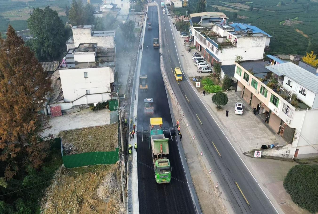 國道318線名山區(qū)黑竹(成都界)至雨城區(qū)多營段改建項目作為四川省重點項目,同時也是雅安“三區(qū)”同城化經濟環(huán)線中北環(huán)線的重要組成部分,自開工以來始終保持高效推進態(tài)勢。為實現2026年春節(jié)前主體工程貫通目標,近期,項目建設現場掀起“大干快上”熱潮,全體參建單位以“時不我待”的緊迫感沖刺節(jié)點任務,各項工作取得突破性進展。截至目前,項目累計完成投資24.95億元,完成產值17.6億元;路基、橋涵、隧道工程均完成90%以上,陸續(xù)進入路面工程階段,前12公里改建段已建成通車。
