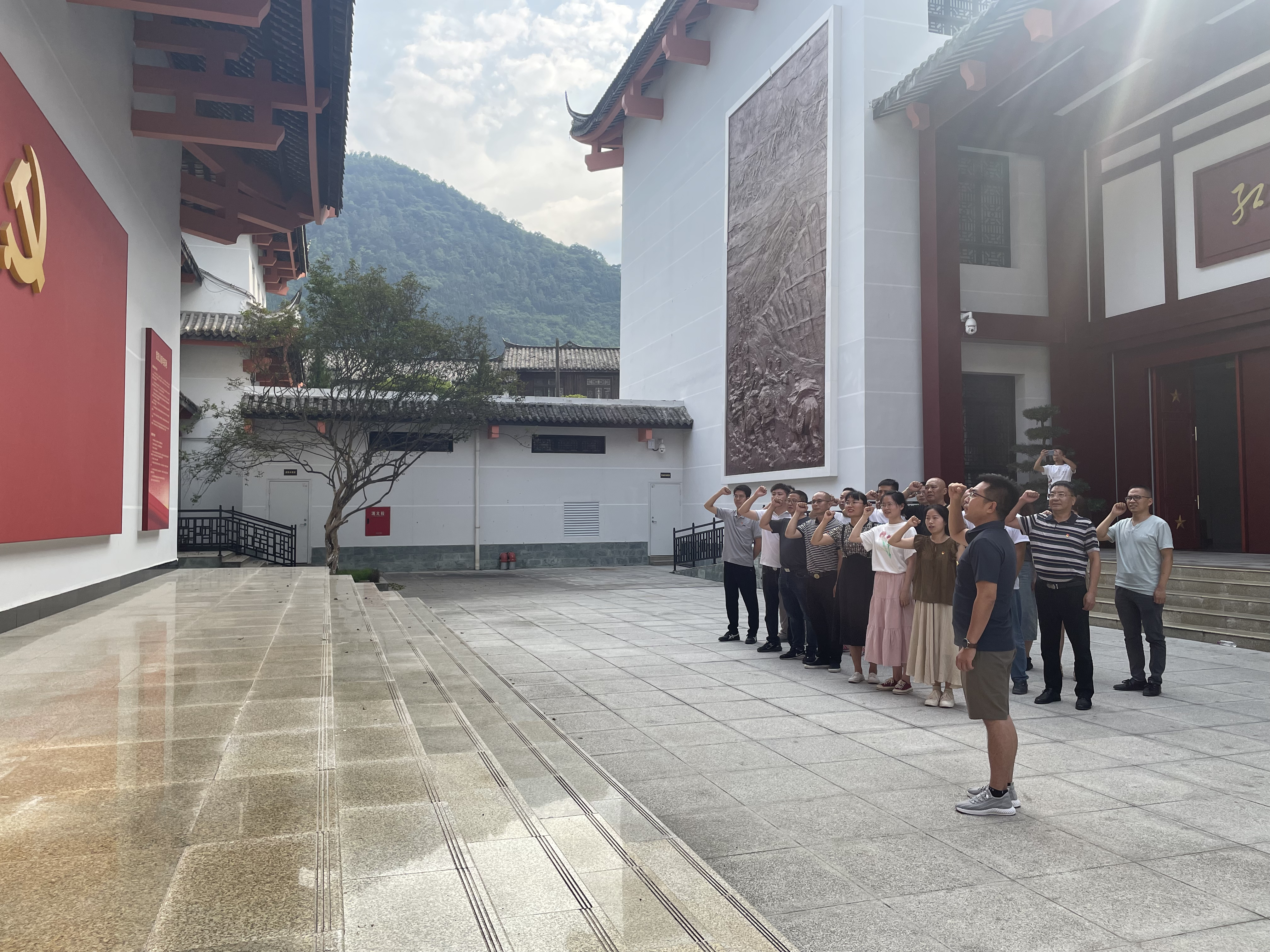 參觀結(jié)束后,黨員干部在紀念館黨旗墻重溫入黨誓詞,雅安交建集團副總經(jīng)理、石棉災(zāi)后重建項目臨時黨支部書記鐘焱宇領(lǐng)誓,全體黨員面對鮮紅的黨旗莊嚴舉起右拳,重溫入黨誓詞,激勵在今后的人生之路上不忘初心、牢記使命、砥礪前行。
