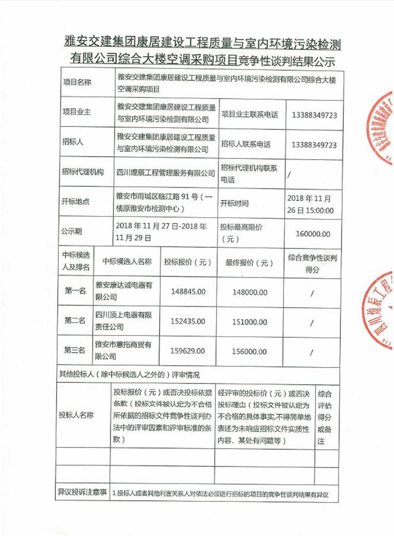 綜合大樓空調(diào)采購項(xiàng)目競(jìng)爭(zhēng)性談判結(jié)果公示