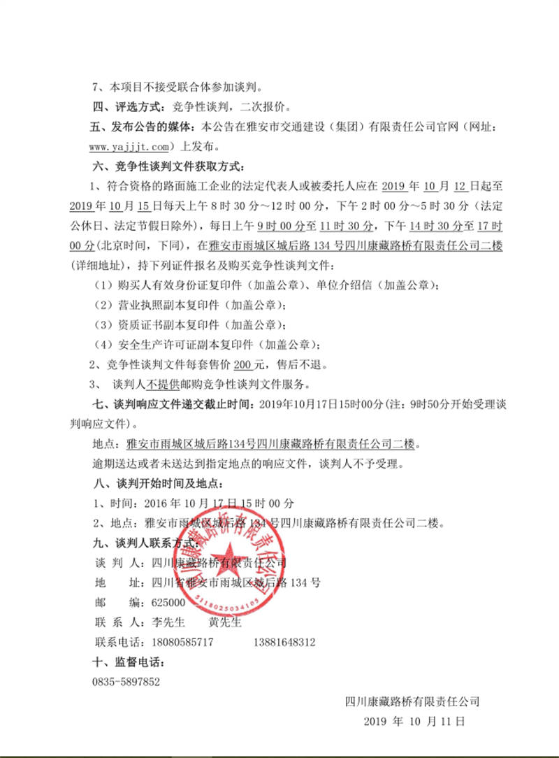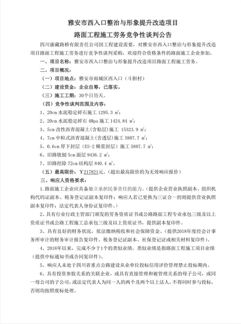 雅安市西入口整治與形象提升改造項目路面工程施工勞務 競爭性談判公告