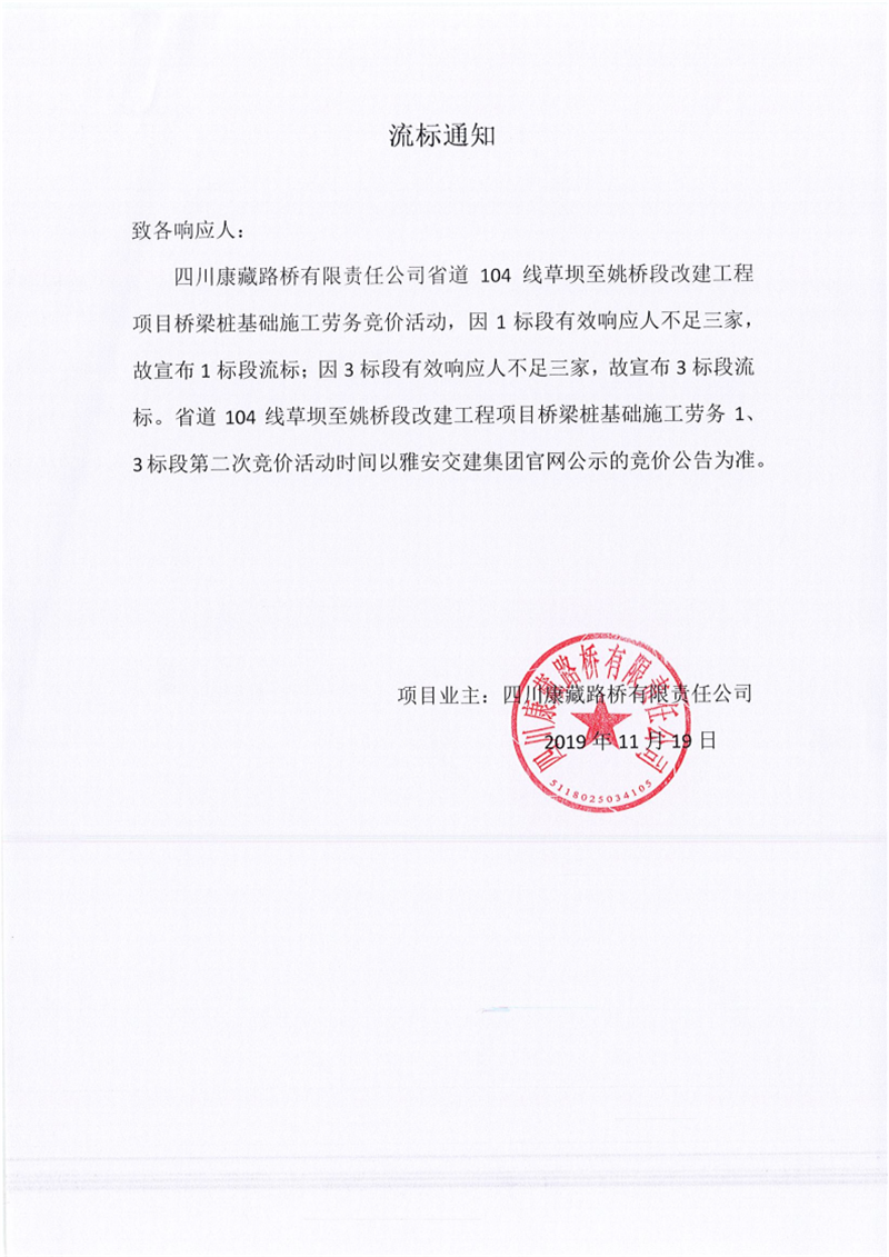 四川康藏路橋有限責(zé)任公司省道104線草壩至姚橋段改建工程項(xiàng)目橋梁樁基礎(chǔ)施工勞務(wù)競價(jià)(1標(biāo)段、3標(biāo)段)流標(biāo)通知