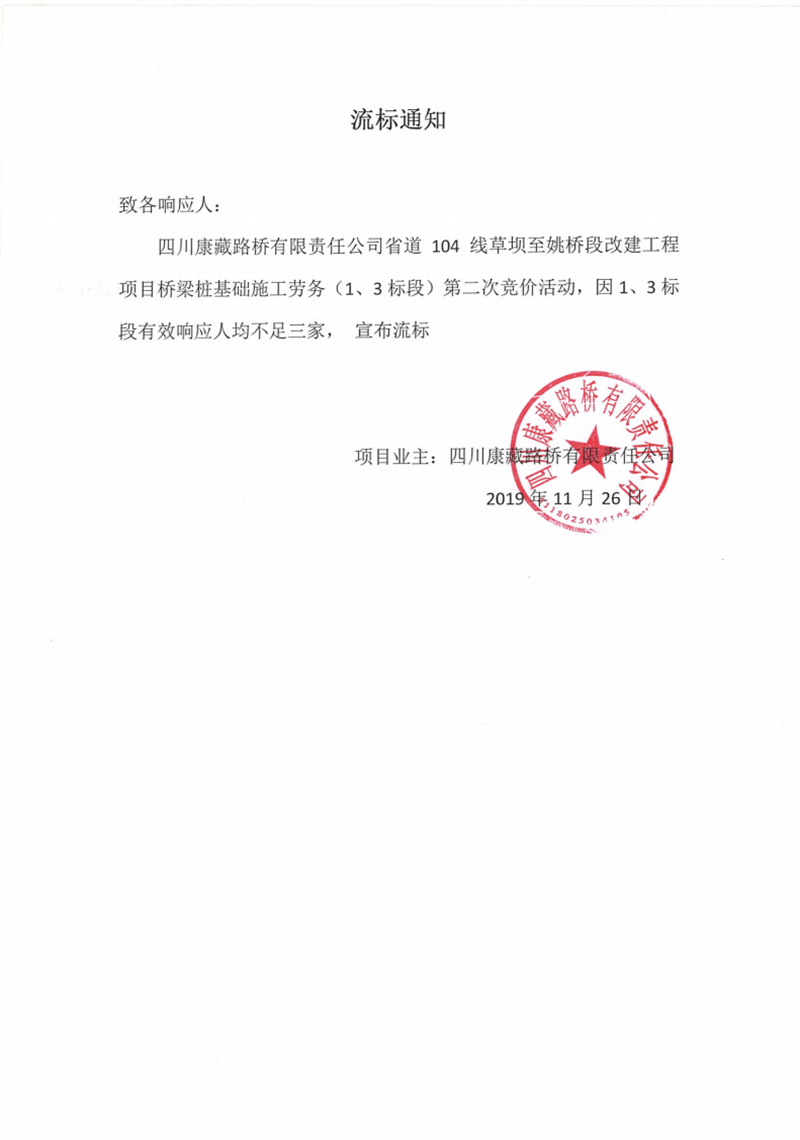 四川康藏路橋有限責(zé)任公司省道104線草壩至姚橋段改建工程項(xiàng)目橋梁樁基礎(chǔ)(1、3標(biāo)段)施工勞務(wù)競價(jià)(第二次)流標(biāo)通知