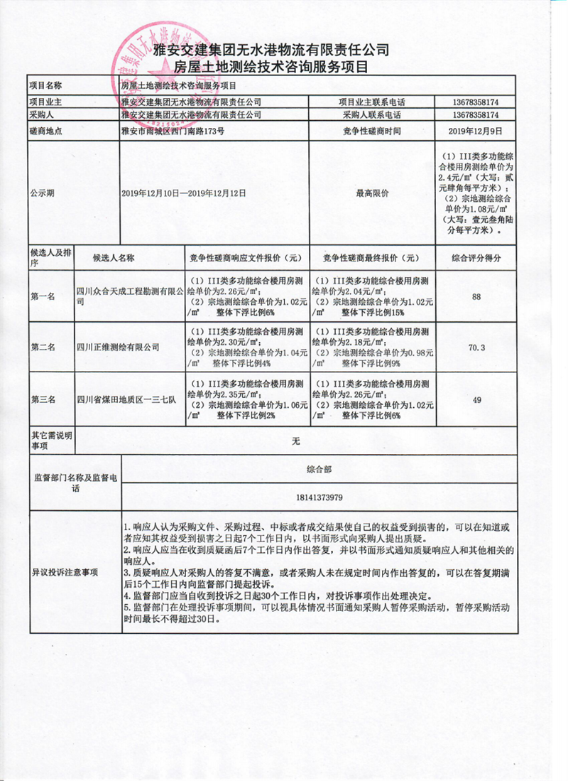 雅安交建集團無水港物流有限責(zé)任公司房屋土地測繪技術(shù)咨詢服務(wù)項目競爭性磋商結(jié)果公示