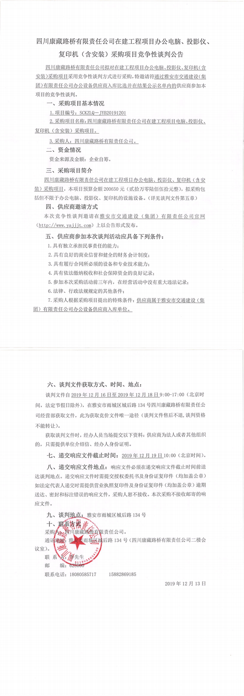 四川康藏路橋有限責(zé)任公司在建工程項(xiàng)目辦公電腦、投影儀、復(fù)印機(jī)(含安裝)采購(gòu)項(xiàng)目競(jìng)爭(zhēng)性談判公告