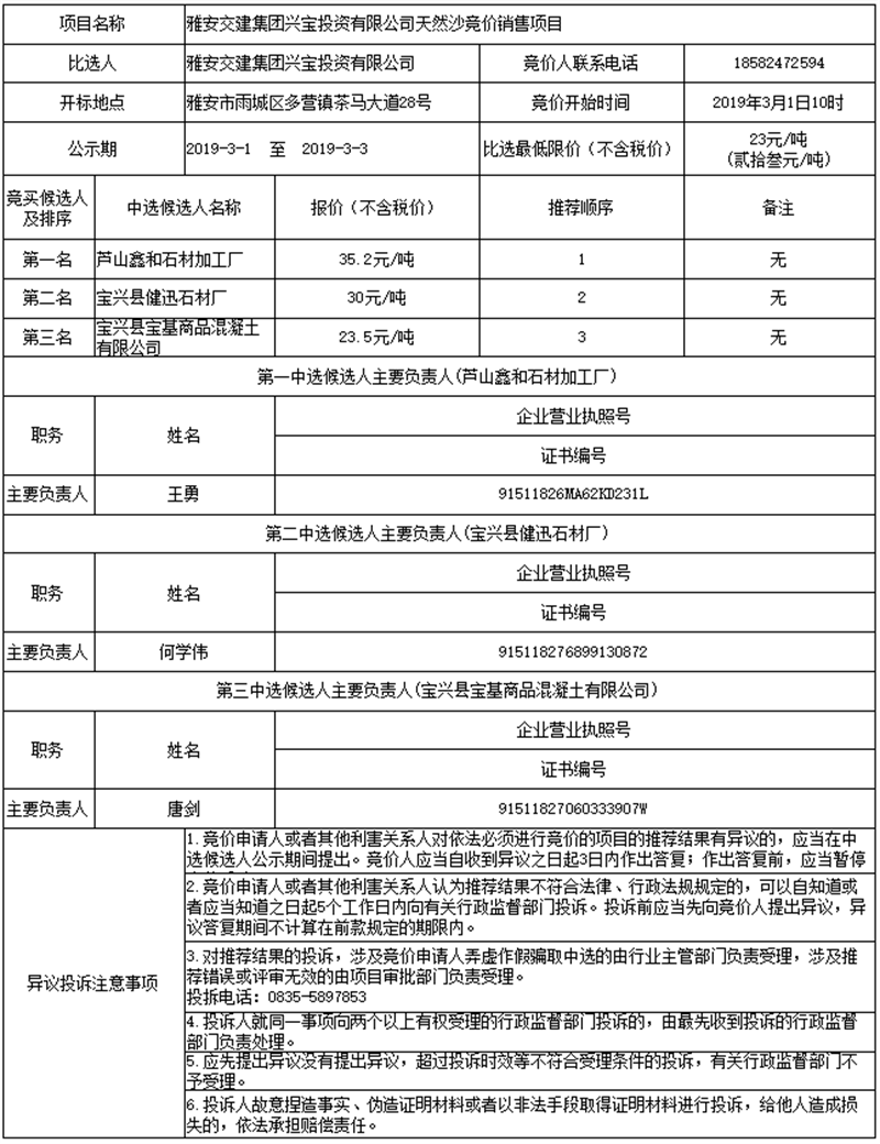 雅安交建集團(tuán)興寶投資有限公司天然沙競價銷售項目公示