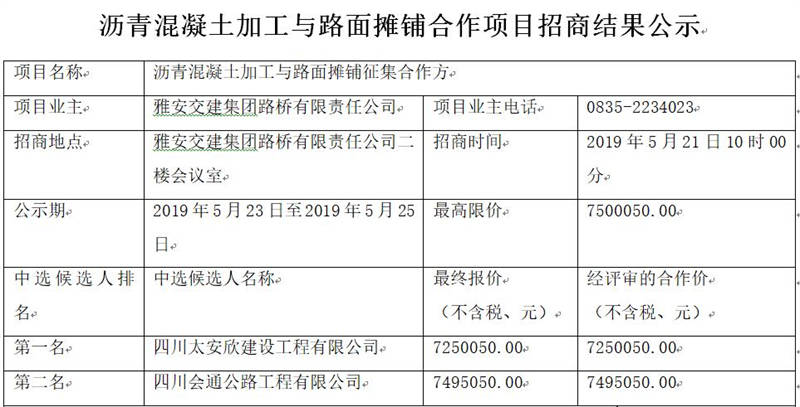 雅安交建集團路橋有限責任公司瀝青混凝土加工與路面攤鋪合作項目招商結果公告
