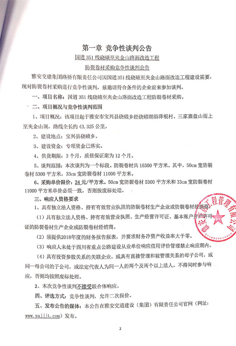 雅安交建集團(tuán)路橋有限責(zé)任公司國道351線磽磧至夾金山路面改造工程防裂卷材采購競(jìng)爭(zhēng)性談判公告