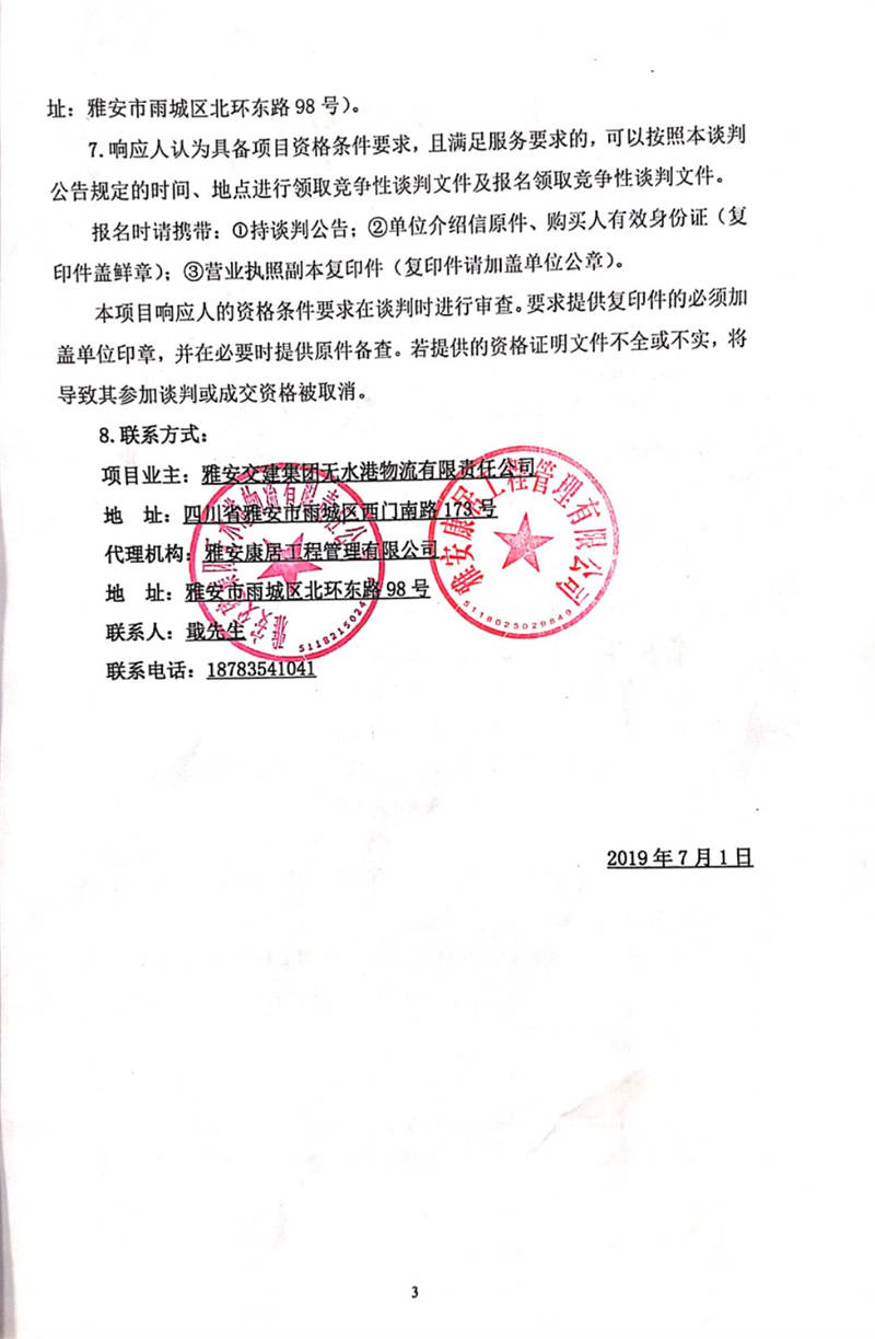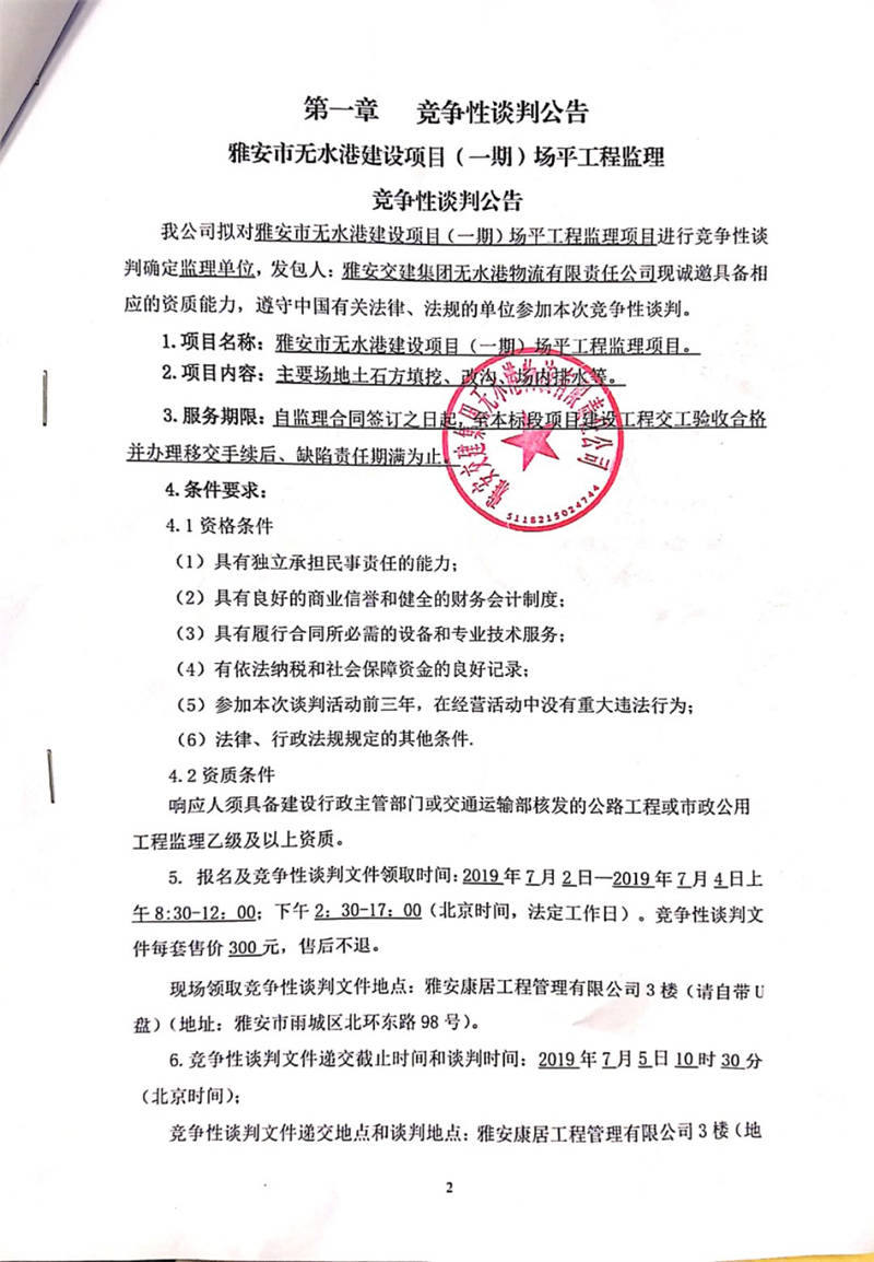 雅安交建集團(tuán)無(wú)水港物流有限責(zé)任公司雅安市無(wú)水港建設(shè)項(xiàng)目(一期)場(chǎng)平工程監(jiān)理競(jìng)爭(zhēng)性談判公告