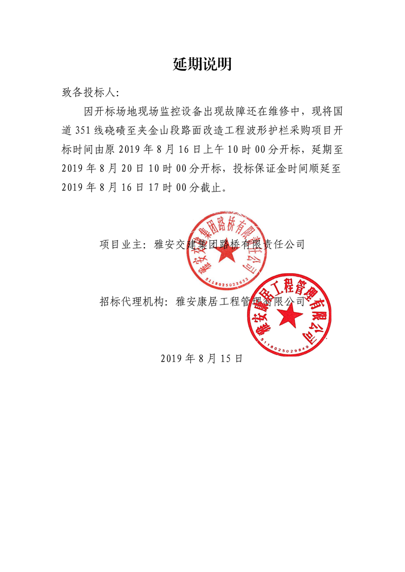 雅安交建集團路橋有限責任公司國道351線磽磧至夾金山段路面改造工程波形護欄采購延期說明