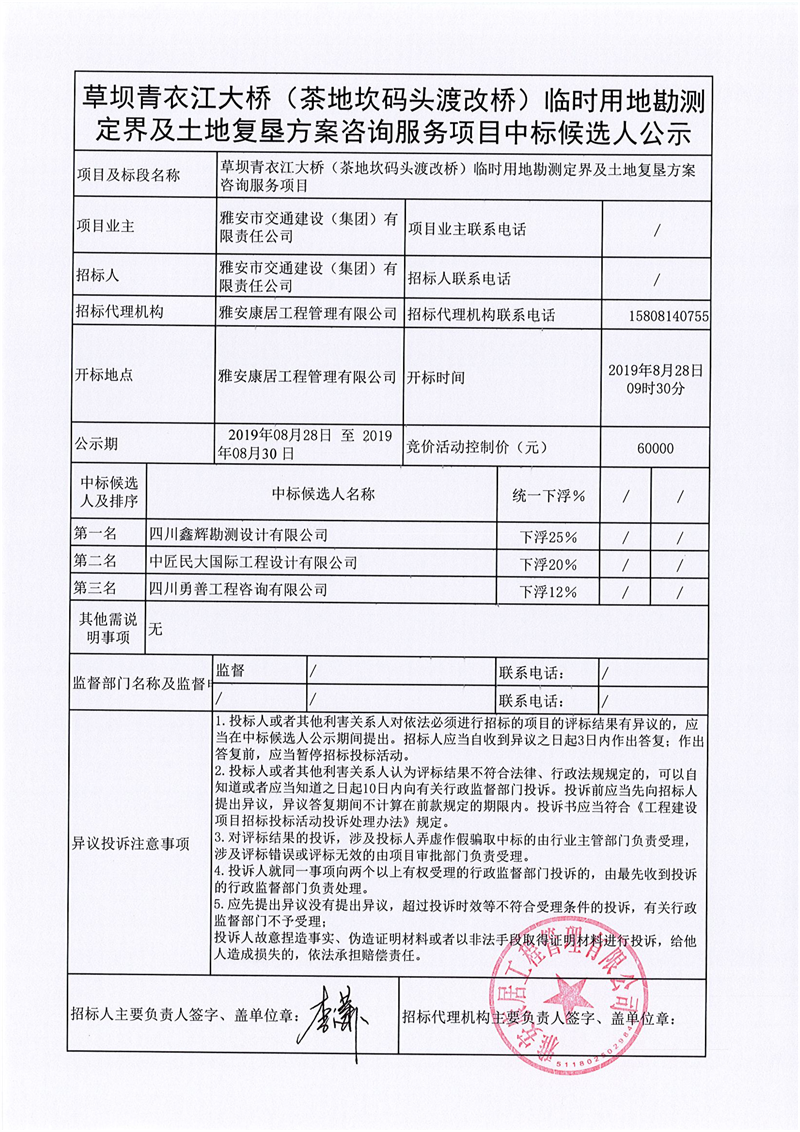 雅安市交通建設(shè)(集團)有限責(zé)任公司草壩青衣江大橋(茶地坎碼頭渡改橋)臨時用地勘測定界及土地復(fù)墾方案咨詢服務(wù)項目競價結(jié)果公示