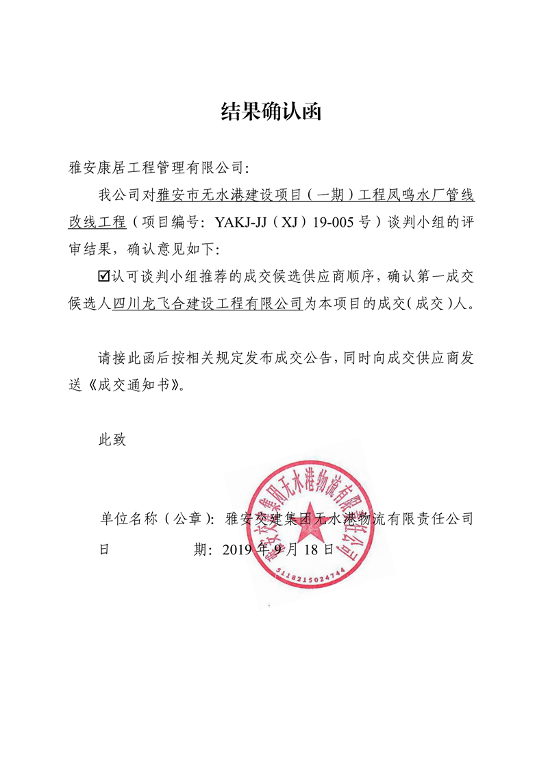 雅安交建集團(tuán)無(wú)水港物流有限責(zé)任公司雅安市無(wú)水港建設(shè)項(xiàng)目(一期)工程鳳鳴水廠管線改線工程競(jìng)爭(zhēng)性談判結(jié)果公示
