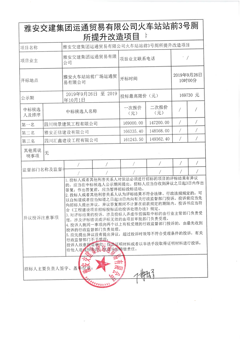 雅安交建集團(tuán)運(yùn)通貿(mào)易有限公司火車(chē)站站前廣場(chǎng)3號(hào)廁所改造提升項(xiàng)目(第二次)競(jìng)爭(zhēng)性談判結(jié)果公示