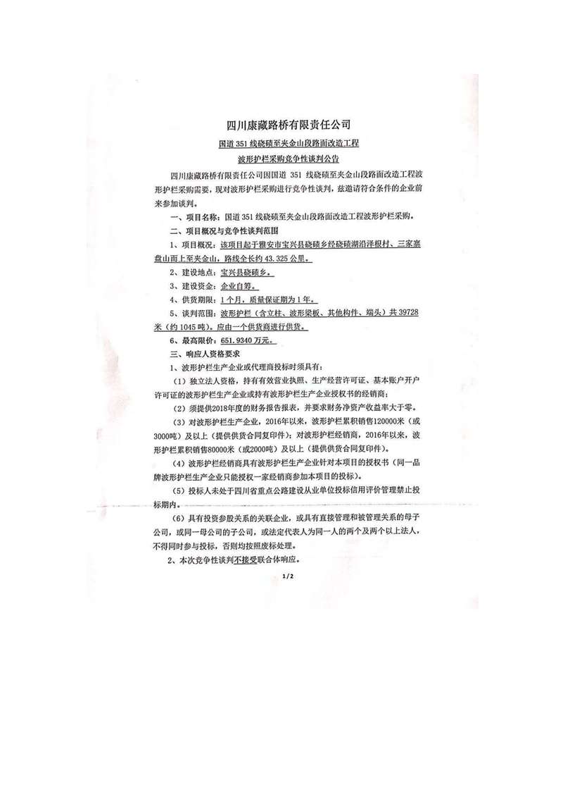 四川康藏路橋有限責(zé)任公司國道351線磽磧至夾金山段路面改造工程波形護欄采購競爭性談判公告
