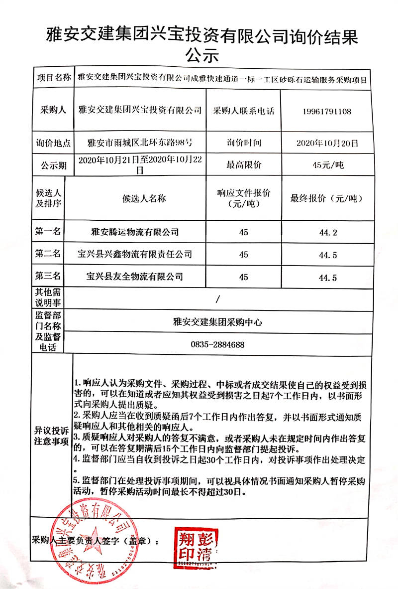 雅安交建集團(tuán)興寶投資有限公司成雅快速通道一標(biāo)一工區(qū)砂礫石運(yùn)輸服務(wù)采購項(xiàng)目詢價(jià)結(jié)果公示