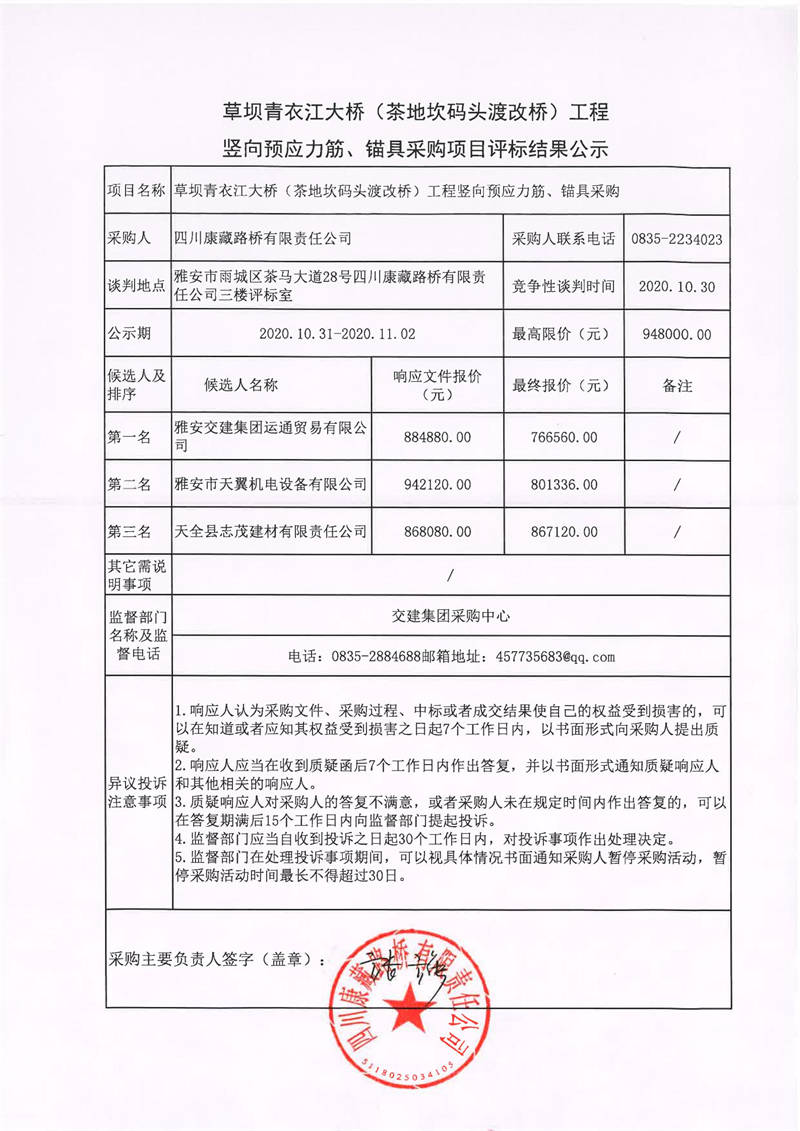 四川康藏路橋有限責任公司草壩青衣江大橋(茶地坎碼頭渡改橋)工程豎向預(yù)應(yīng)力筋、錨具采購項目評標結(jié)果公示