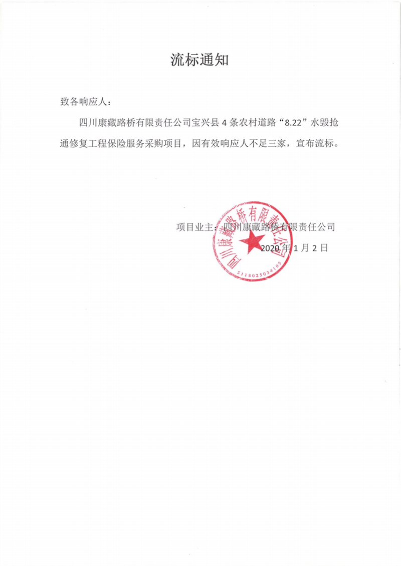 四川康藏路橋有限責(zé)任公司寶興縣4條農(nóng)村道路“8.22”水毀搶通修復(fù)工程保險服務(wù)采購項目流標(biāo)通知