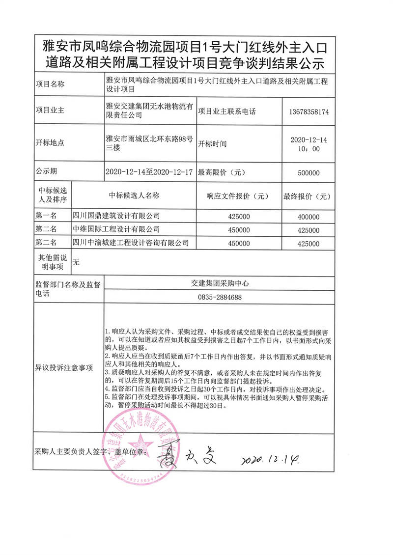 雅安交建集團無水港物流有限責(zé)任公司雅安市鳳鳴綜合物流園項目1號大門紅線外主入口道路及相關(guān)附屬工程設(shè)計項目談判結(jié)果公示