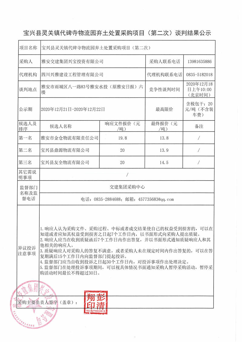 雅安交建集團興寶投資有限公司寶興縣靈關(guān)鎮(zhèn)代碑寺物流園棄土處置采購項目(第二次)談判結(jié)果公示