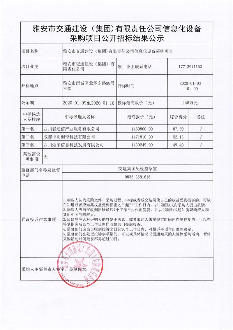 雅安市交通建設(shè)(集團)有限責(zé)任公司信息化設(shè)備采購項目公開招標(biāo)結(jié)果公示