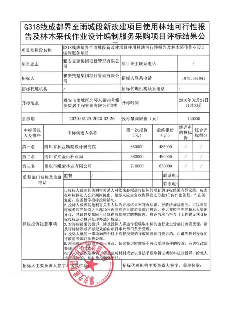 雅安交建集團項目管理有限公司G318線成都界至雨城段新改建項目使用林地可行性報告及林木采伐作業(yè)設計編制服務采購項目評標結果公示
