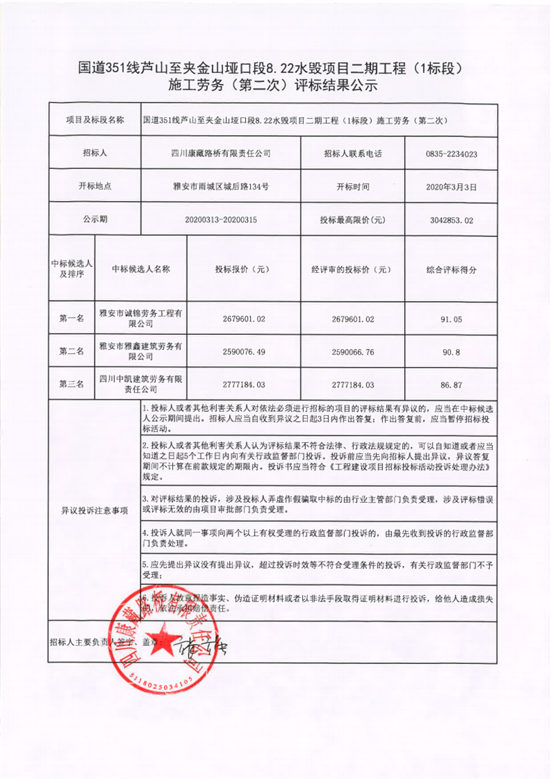 四川康藏路橋有限責任公司國道351線蘆山至夾金山埡口段8.22水毀項目二期工程(1標段)施工勞務(wù)(第二次)評標結(jié)果公示