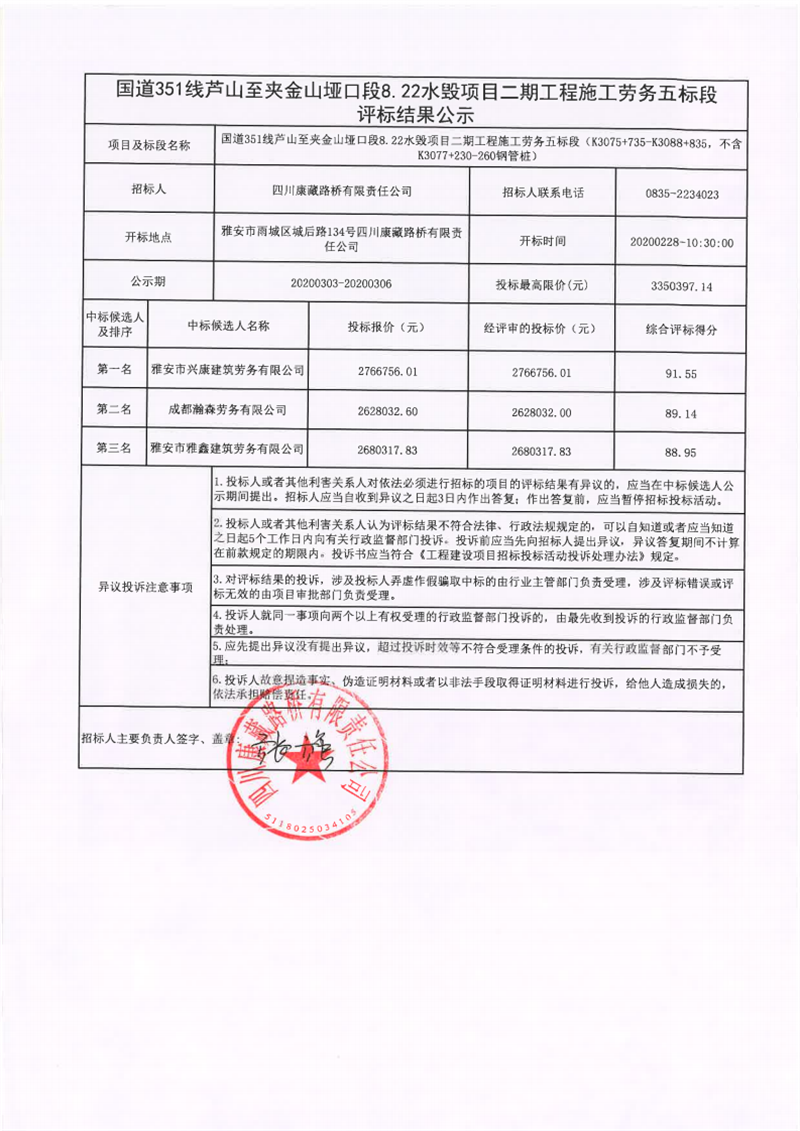 四川康藏路橋有限責任公司國道351線蘆山至夾金山埡口段8.22水毀項目二期工程施工勞務五標段評標結果公示