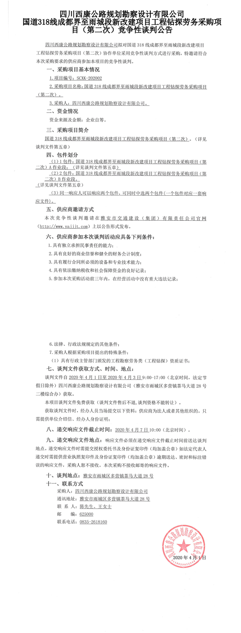 四川西康公路規(guī)劃勘察設計有限公司國道318線成都界至雨城段新改建項目工程鉆探勞務采購項目(第二次)競爭性談判公告