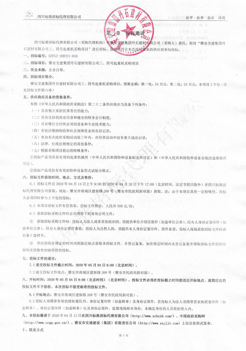 雅安交建集團丹石建材有限公司三、四號起重機采購項目招標(biāo)公告