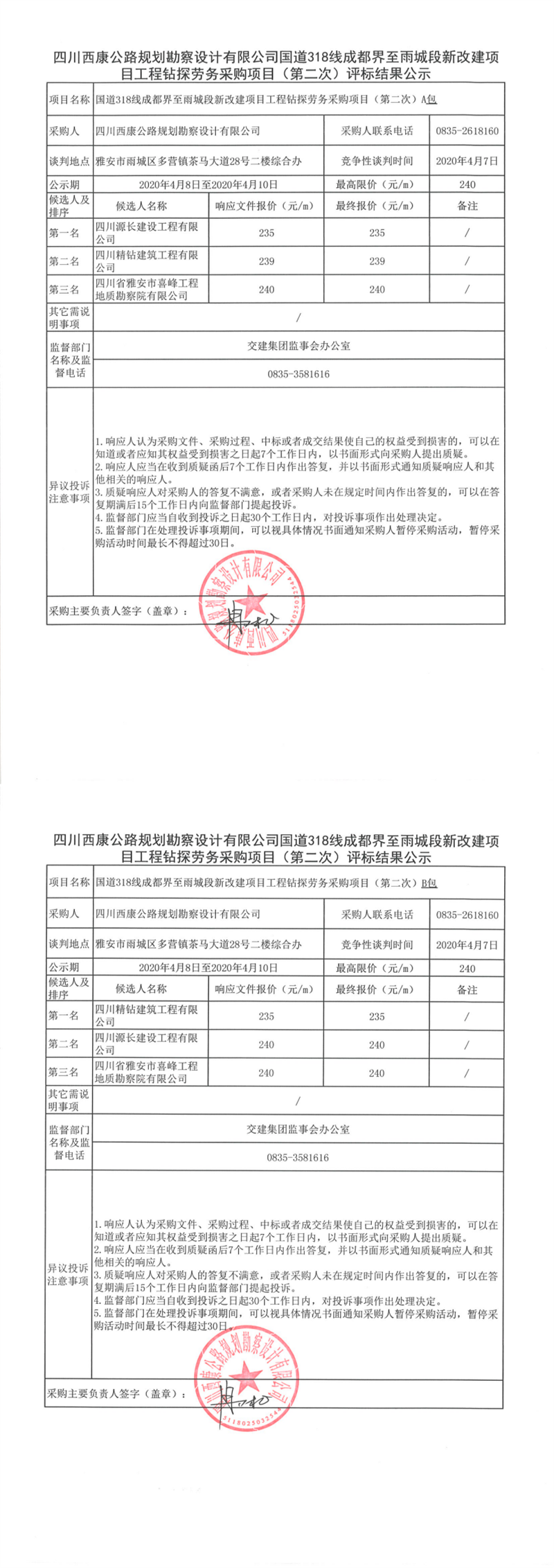 四川西康公路規(guī)劃勘察設(shè)計(jì)有限公司國道318線成都界至雨城段新改建項(xiàng)目工程鉆探勞務(wù)采購項(xiàng)目(第二次)評標(biāo)結(jié)果公示