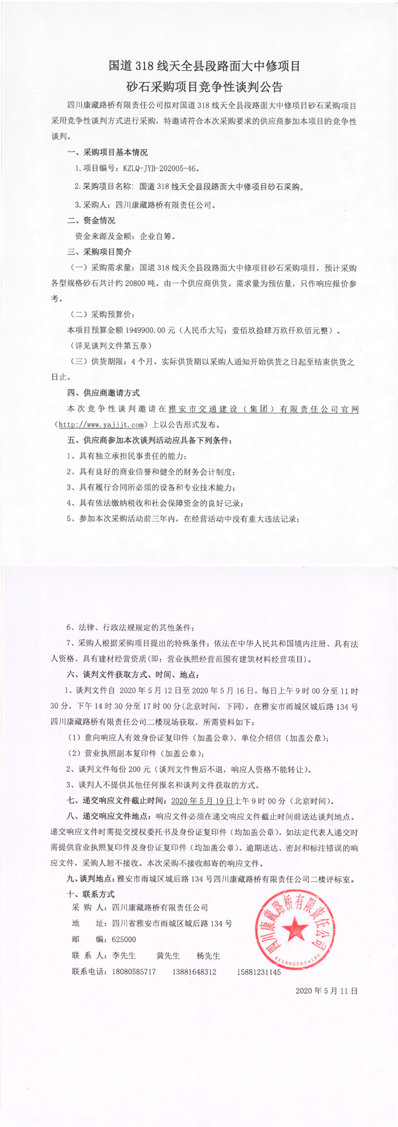 四川康藏路橋有限責(zé)任公司國道318線天全縣段路面大中修項目砂石采購項目競爭性談判公告