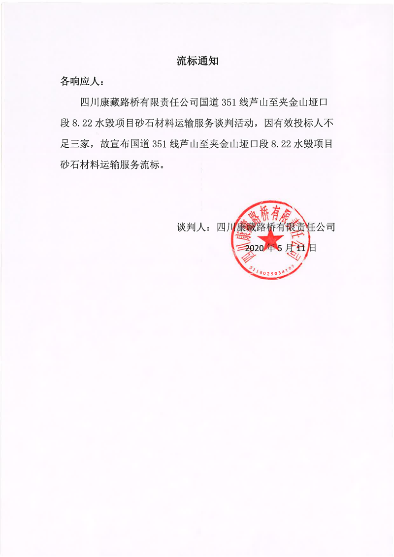 四川康藏路橋有限責任公司國道351線蘆山至夾金山埡口段8.22水毀項目砂石材料運輸服務流標通知