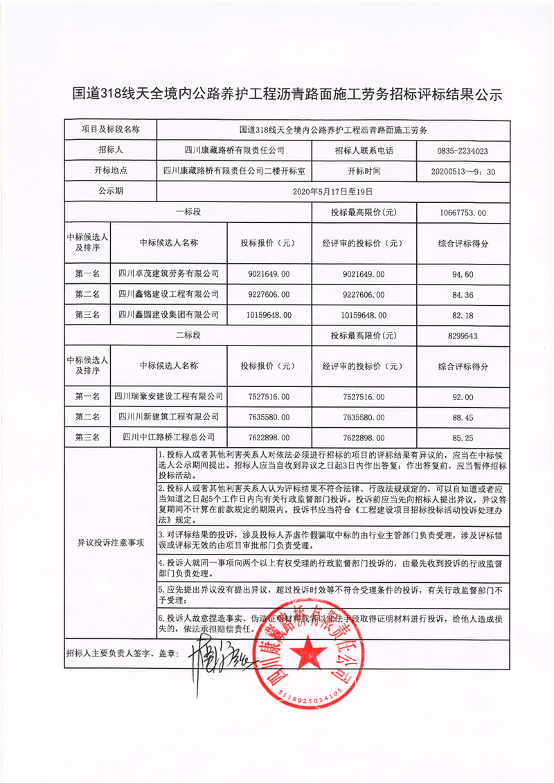 四川康藏路橋有限責任公司國道318線天全境內(nèi)公路養(yǎng)護工程瀝青路面施工勞務(wù)招標評標結(jié)果公示