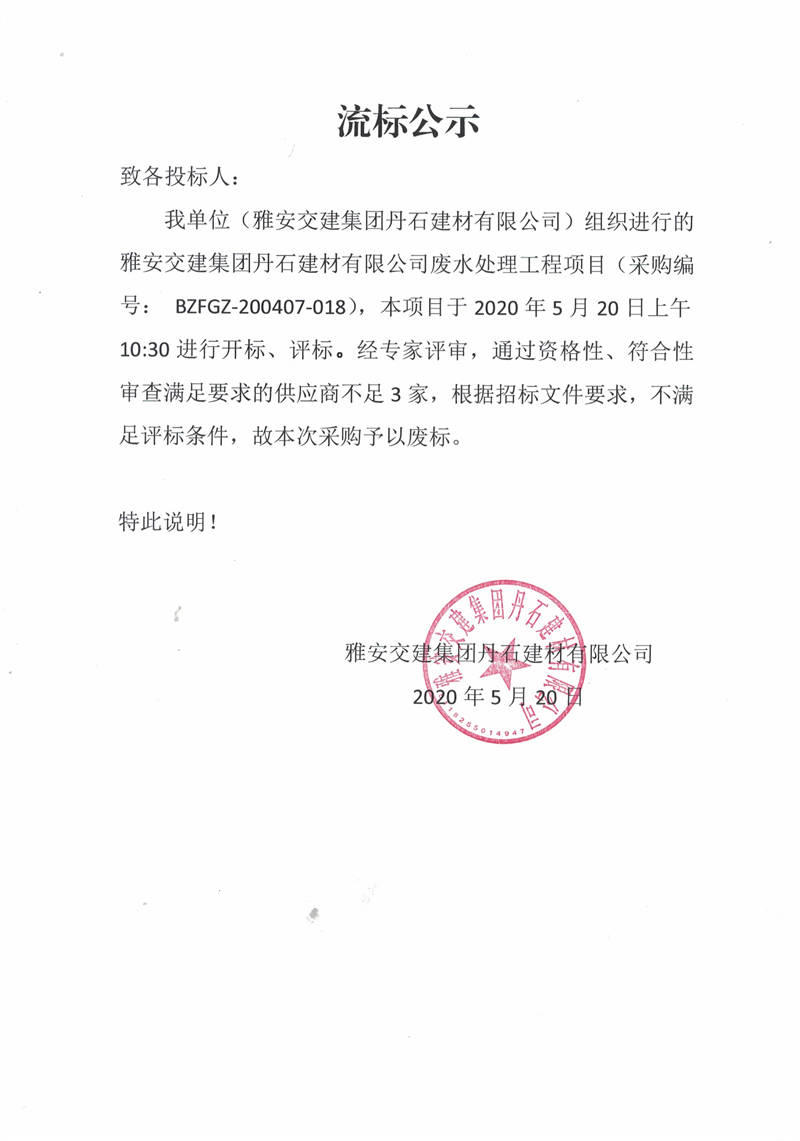 雅安交建集團(tuán)丹石建材有限公司廢水處理工程項目流標(biāo)公示