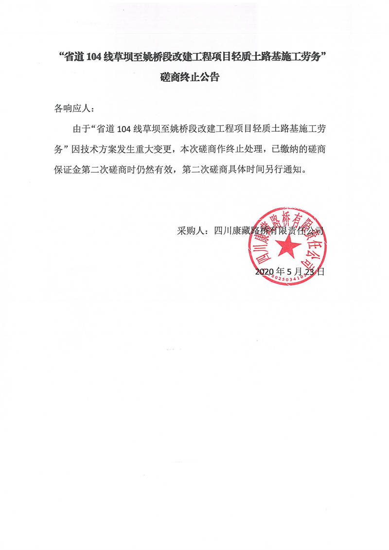 四川康藏路橋有限責任公司省道104線草壩至姚橋段改建工程項目輕質(zhì)土路基施工勞務磋商終止公告