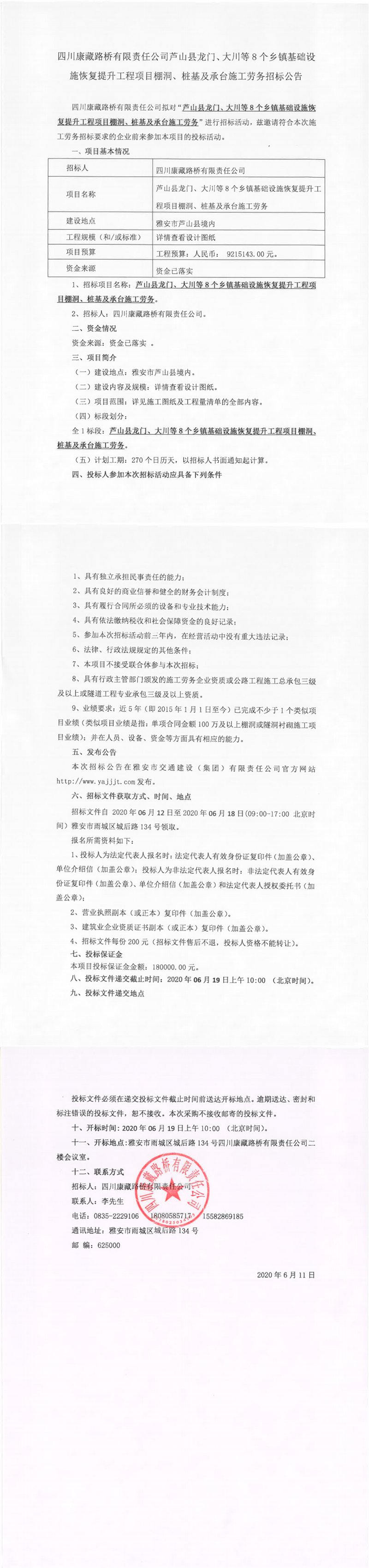 四川康藏路橋有限責任公司蘆山縣龍門、大川等8個鄉(xiāng)鎮(zhèn)基礎(chǔ)設(shè)施恢復提升工程項目棚洞、樁基及承臺施工勞務招標公告