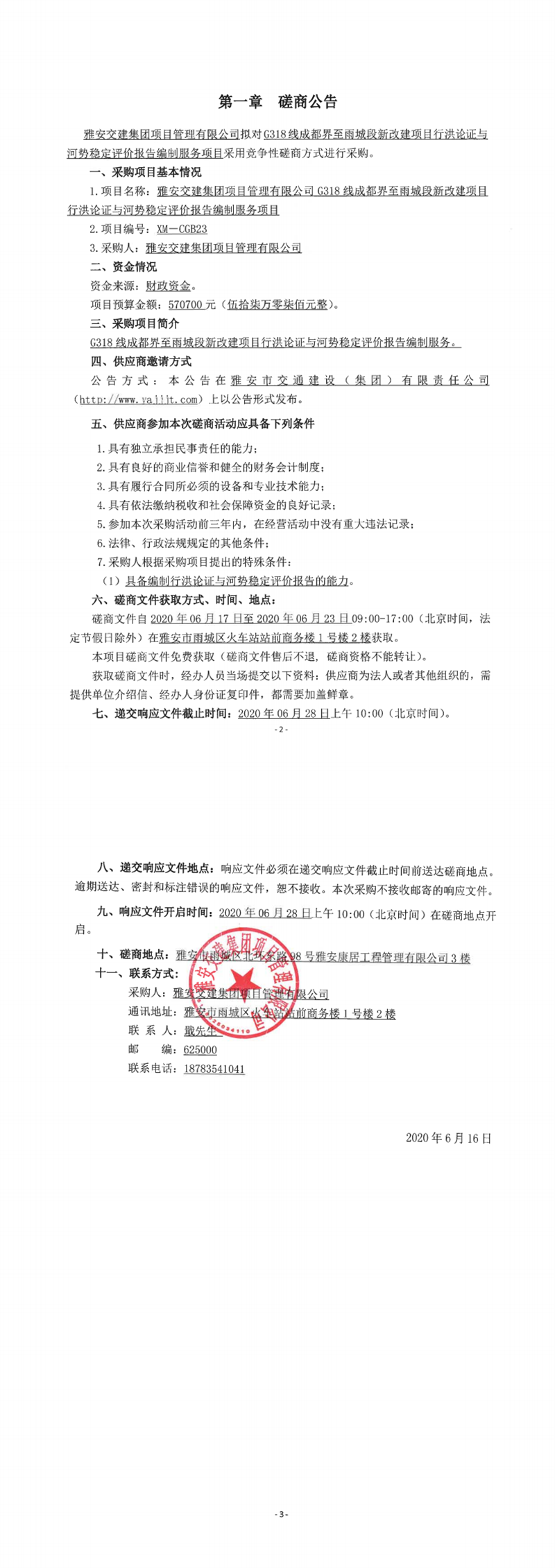 雅安交建集團(tuán)項目管理有限公司G318線成都界至雨城段新改建項目行洪論證與河勢穩(wěn)定評價報告編制服務(wù)項目競爭性磋商公告