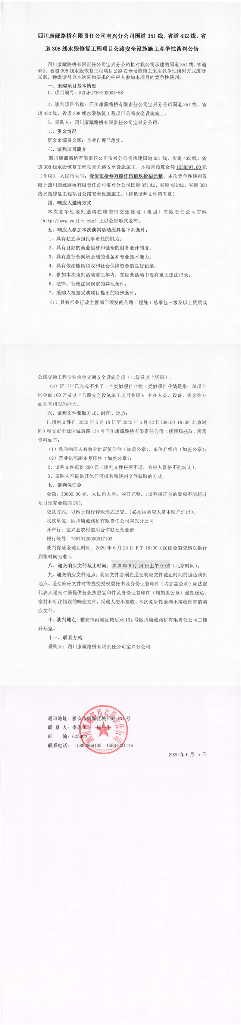 四川康藏路橋有限責(zé)任公司寶興分公司國(guó)道351線、省道432線、省道308線水毀修復(fù)工程項(xiàng)目公路安全設(shè)施施工競(jìng)爭(zhēng)性談判公告