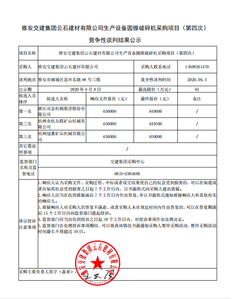 雅安交建集團云石建材有限公司生產(chǎn)設(shè)備圓錐破碎機采購項目(第四次)競爭性談判結(jié)果公示