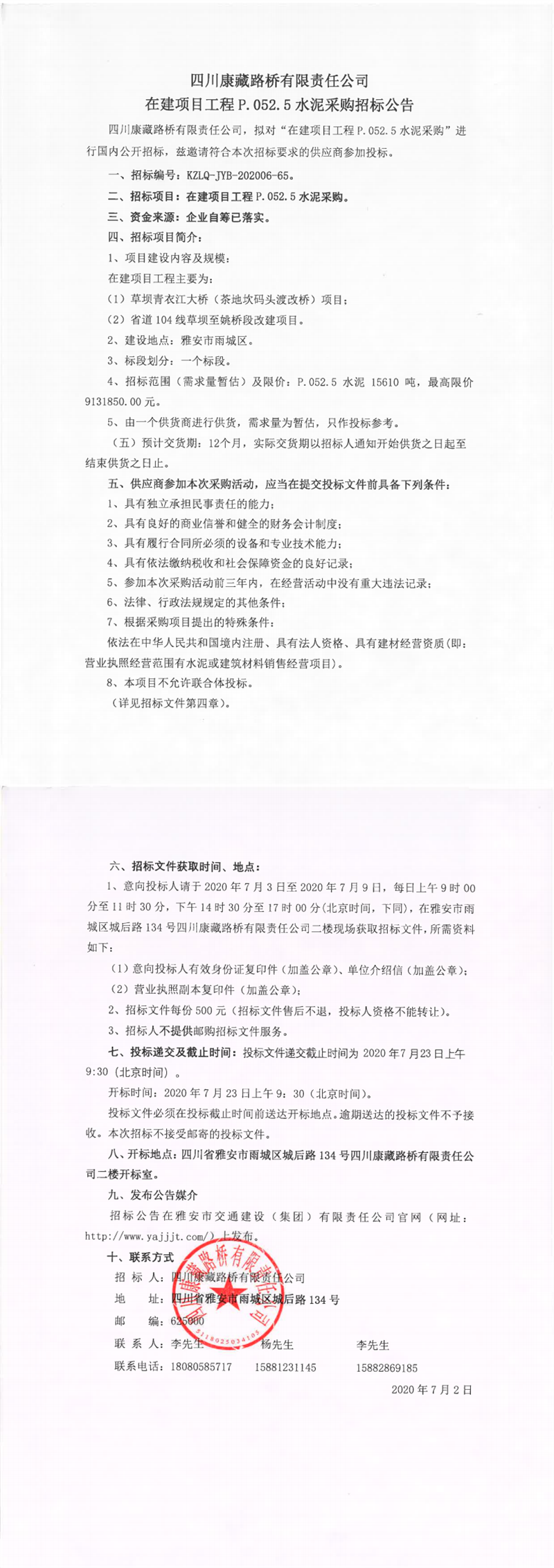 四川康藏路橋有限責(zé)任公司在建項(xiàng)目工程P.052.5水泥采購招標(biāo)公告