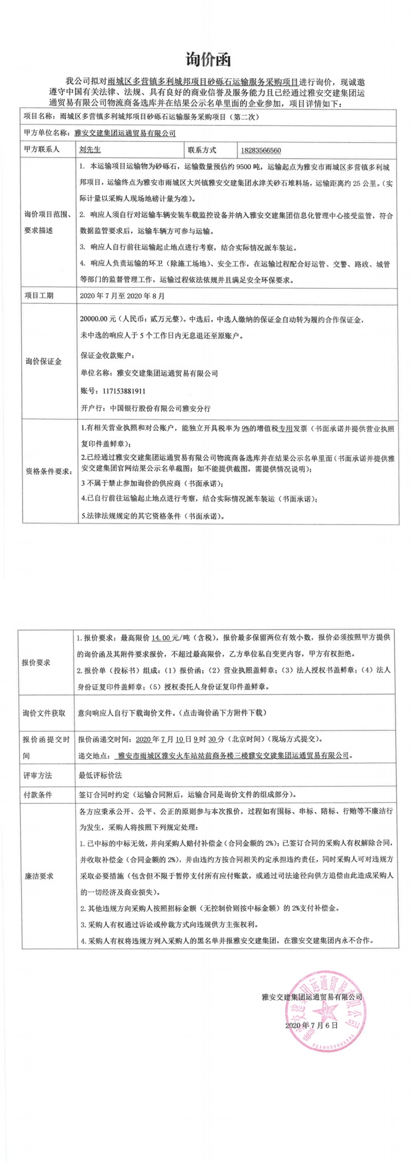 雅安交建集團(tuán)運通貿(mào)易有限公司雨城區(qū)多營鎮(zhèn)多利城邦項目砂礫石運輸服務(wù)采購項目(第二次)詢價函