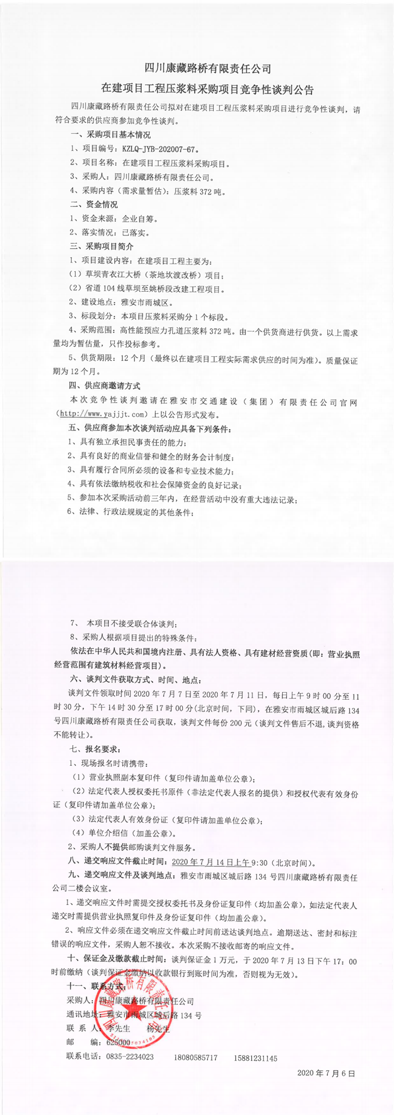 四川康藏路橋有限責(zé)任公司在建項(xiàng)目工程壓漿料采購項(xiàng)目競爭性談判公告