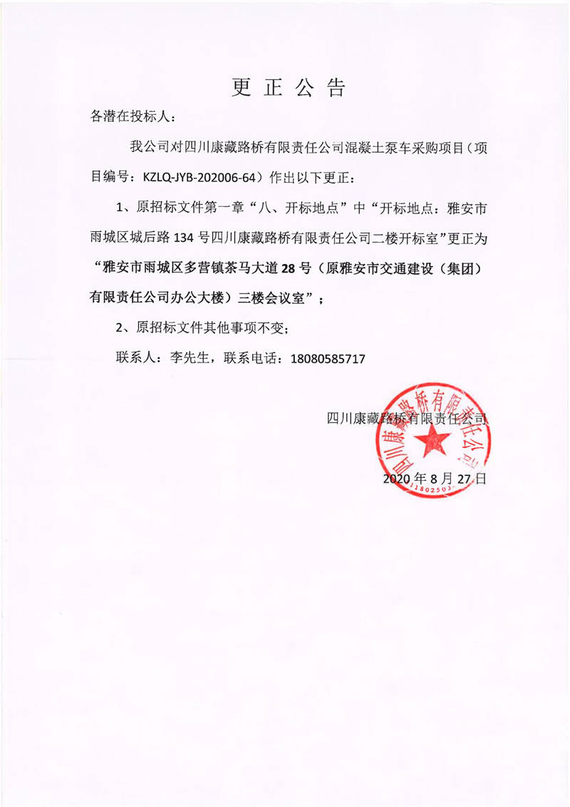 四川康藏路橋有限責任公司混凝土泵車采購項目更正公告