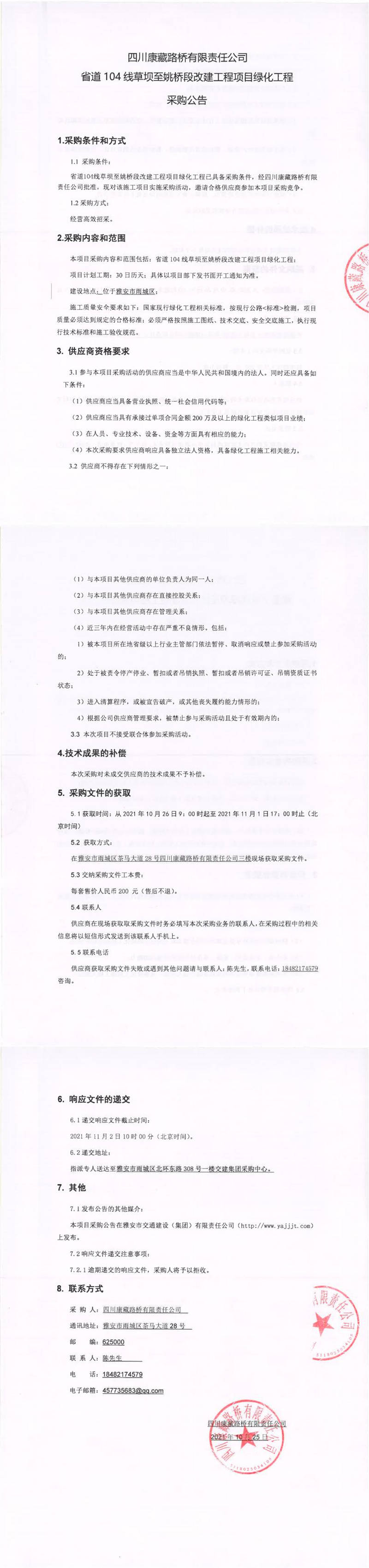 四川康藏路橋有限責(zé)任公司省道104線草壩至姚橋段改建工程項(xiàng)目綠化工程采購(gòu)公告