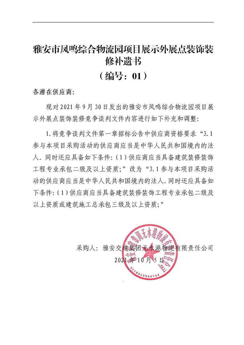 雅安交建集團(tuán)無(wú)水港物流有限責(zé)任公司雅安市鳳鳴綜合物流園項(xiàng)目展示外展點(diǎn)裝飾裝修補(bǔ)遺書(shū)