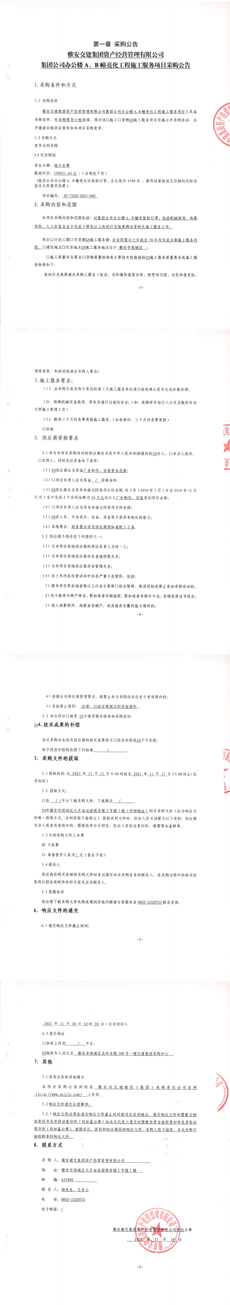 雅安交建集團(tuán)資產(chǎn)經(jīng)營管理有限公司集團(tuán)公司辦公樓A、B幢亮化工程施工服務(wù)項目采購公告